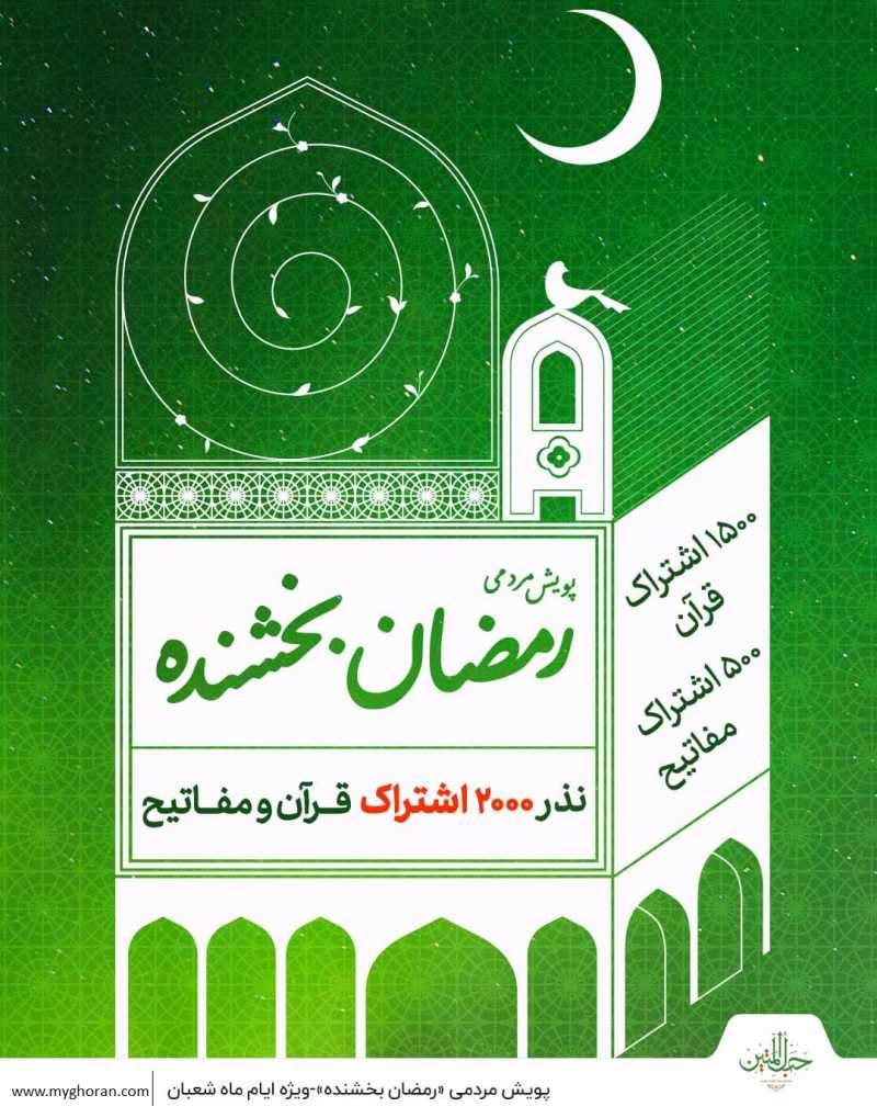 با عنایت به اهمیت و جایگاه تلاوت آیات قرآن و ادعیه مجرب مفاتیح الجنان در شعبان و به ویژه ماه میهمانی خدا رمضان، بار دیگر پویش مردمی نذر قرآن و مفاتیح را با عنوان« رمضان بخشنده» ، به پاس همراهی ارزشمندتان، به اشتراک نهادهایم.پویشی که در قالب آن اشتراکهای اهدا شده، قبل از ماه رمضان، به صورت رایگان در اختیار عموم قرار خواهد گرفت تا در ماه میهمانی پروردگار از آن بهرهمند شوند.